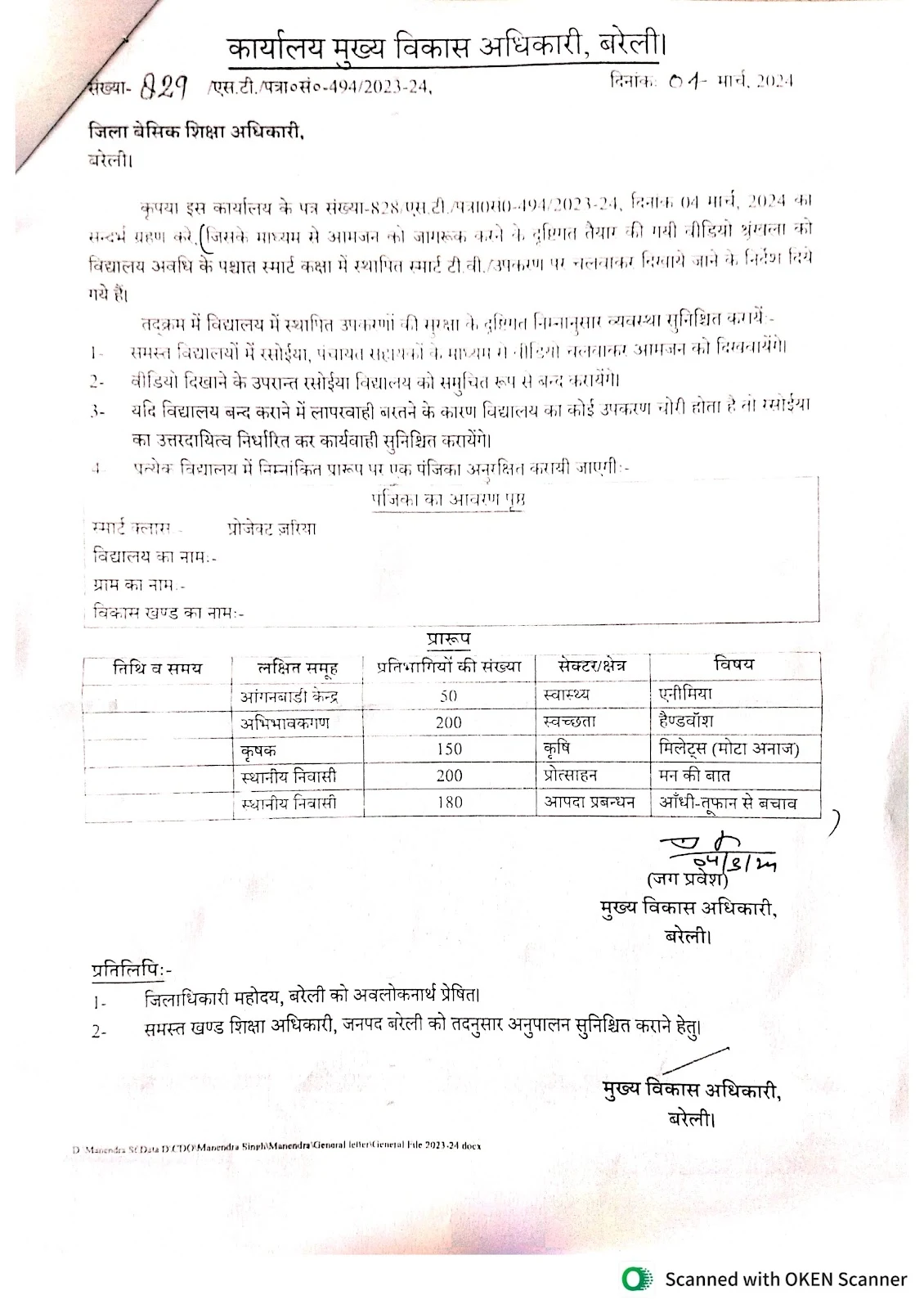 अब विद्यालय समय के उपरांत स्मार्ट क्लास चलाएंगे रसोईया आमजन को करेंगे जागरूक। स्मार्ट क्लास चलाने के उपरांत यदि विद्यालय बंद करने में लापरवाही की गई तो रसोईया का उत्तरदायित्व निर्धारित करते हुए कार्यवाही होगी।