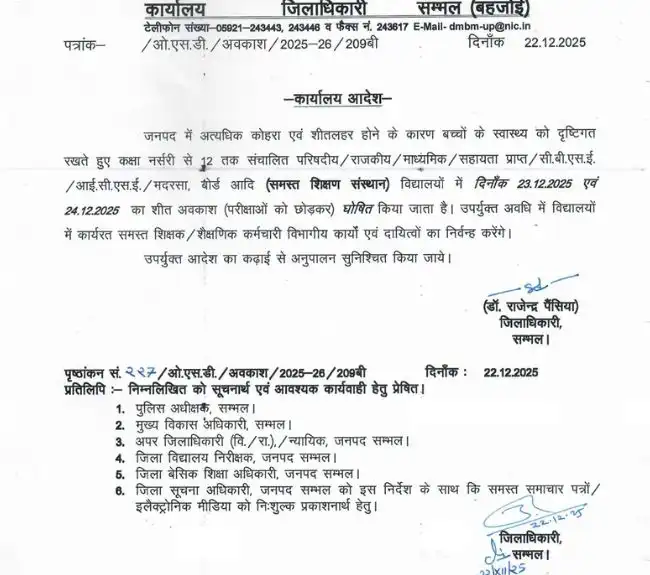 अवकाश के दौरान स्कूलों में कार्यरत शिक्षक और शैक्षणिक कर्मचारी अपने विभागीय कार्यों और अन्य जिम्मेदारियों का निर्वहन करते रहेंगे। डीएम डा. राजेंद्र पैंसिया ने निर्देश दिया है कि आदेश का पालन हर हाल में किया जाना चाहिए। लगातार गिरते तापमान और घने कोहरे के कारण बच्चों को होने वाली परेशानियों को देखते हुए यह फैसला लिया गया है, ताकि सर्दी के मौसम में उनके स्वास्थ्य पर कोई प्रतिकूल असर न पड़े।