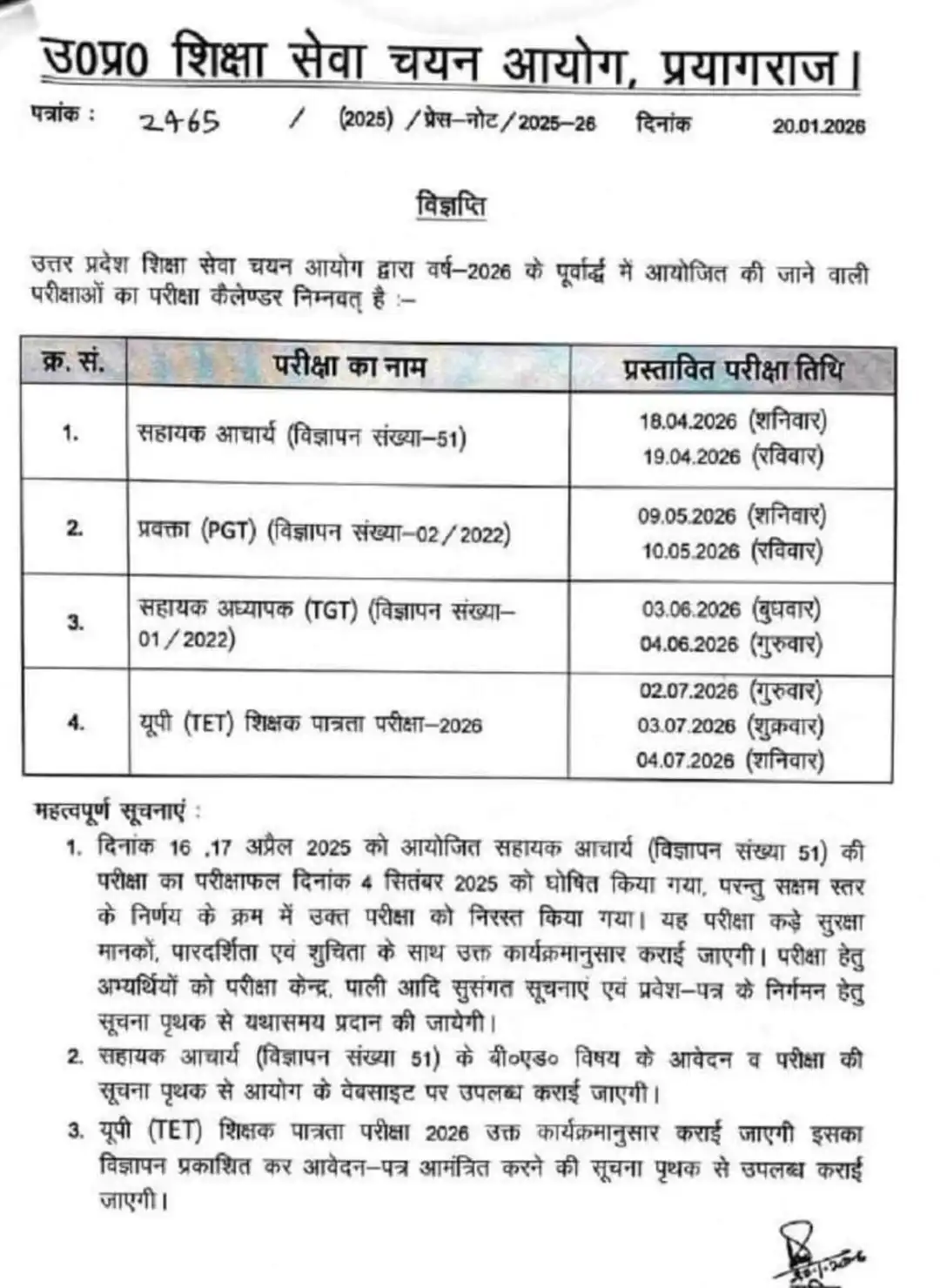 आयोग ने यूपी टीजीटी भर्ती परीक्षा की तारीख 3 और 4 जून को प्रस्तावित किया है. आयोग ने यह भी बताया है कि यूपी शिक्षक पात्रता परीक्षा (UP TET) 2026 का आयोजन 2, 3 और 04 जुलाई 2026 को किया जाएगा.