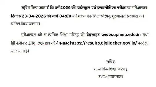 UP Board Result 2026 Kab Aayega: उत्तर प्रदेश माध्यमिक शिक्षा परिषद (UPMSP) ने अभी-अभी UP बोर्ड रिजल्ट 2026 की तारीख और समय की घोषणा कर दी है। UPMSP कल यानी 23 अप्रैल को यूपी बोर्ड कक्षा 10वीं और 12वीं का परिणाम जारी करेगा।